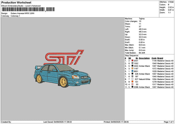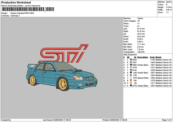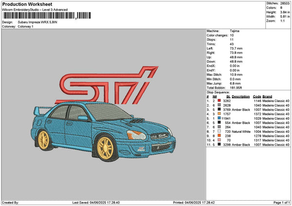 Blue Car Wrx Embroidery File 6 sizes