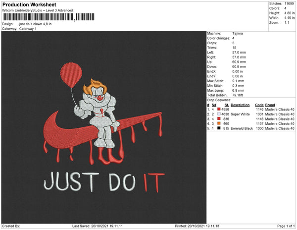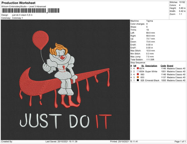 Just Do It Clown Embroidery File 4 size