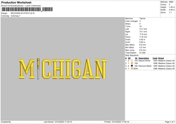 Michigan W Stick Embroidery File 6 sizes